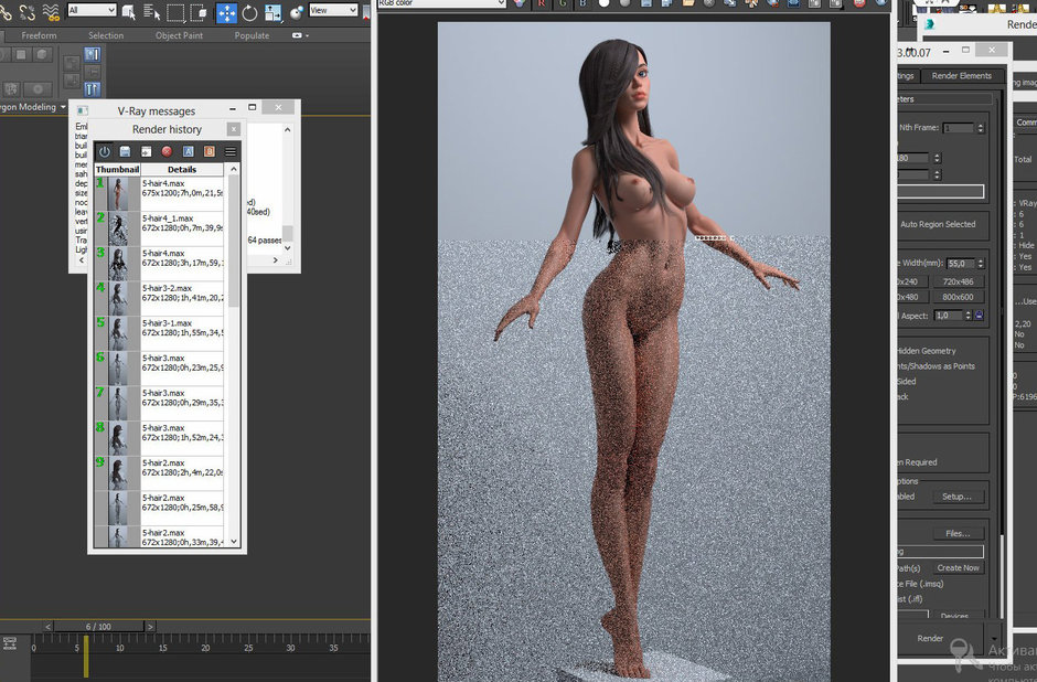 3d model of the female figure. Sculpting was done in zbrush. Visualization - Vray, hair zbrush exported from the curves, then import in 3ds max and attached to Hair & fur modifier. We had to share on tresses in order to separate the strands do not mix with each other.